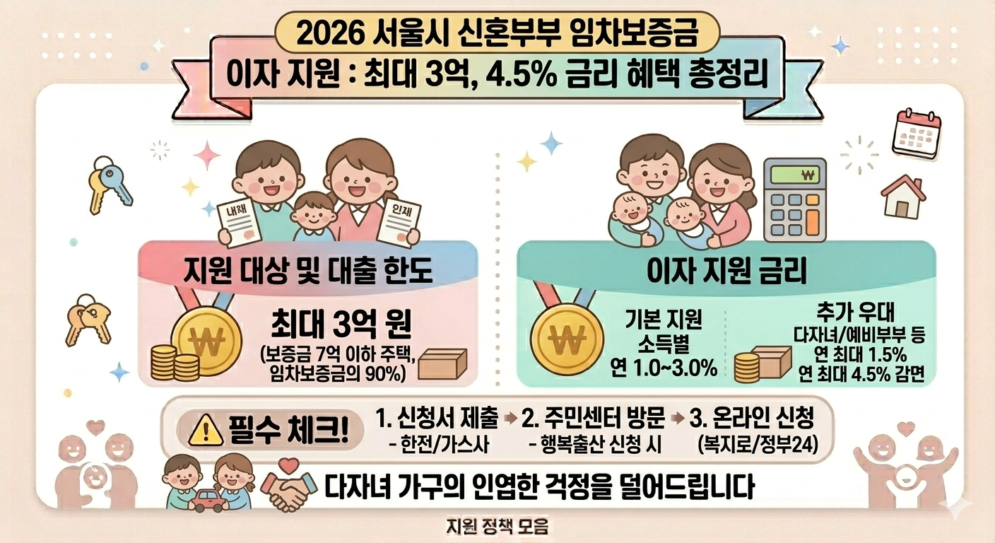 서울에서 전셋집 구하기, 대출 이자 때문에 망설여지시죠? 서울시가 운영하는 '신혼부부 임차보증금 이자 지원' 사업을 이용하면 시중 은행 금리보다 훨씬 저렴하게 주거 문제를 해결할 수 있습니다. 특히 2026년부터는 자녀 출산 시 지원 기간이 대폭 늘어나는 등 혜택이 더욱 강화되었는데요. '몽땅정보 만능키'에서 신청하기 전, 꼭 알아야 할 핵심 정보를 정리해 드립니다!