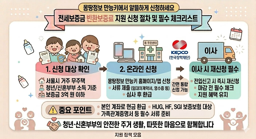 - 신청 기간 확인: 신청 마감 전 꼭 신청하세요! 이사 시 재신청 필수입니다. 주택 보증금 3억 원 이하입니다.