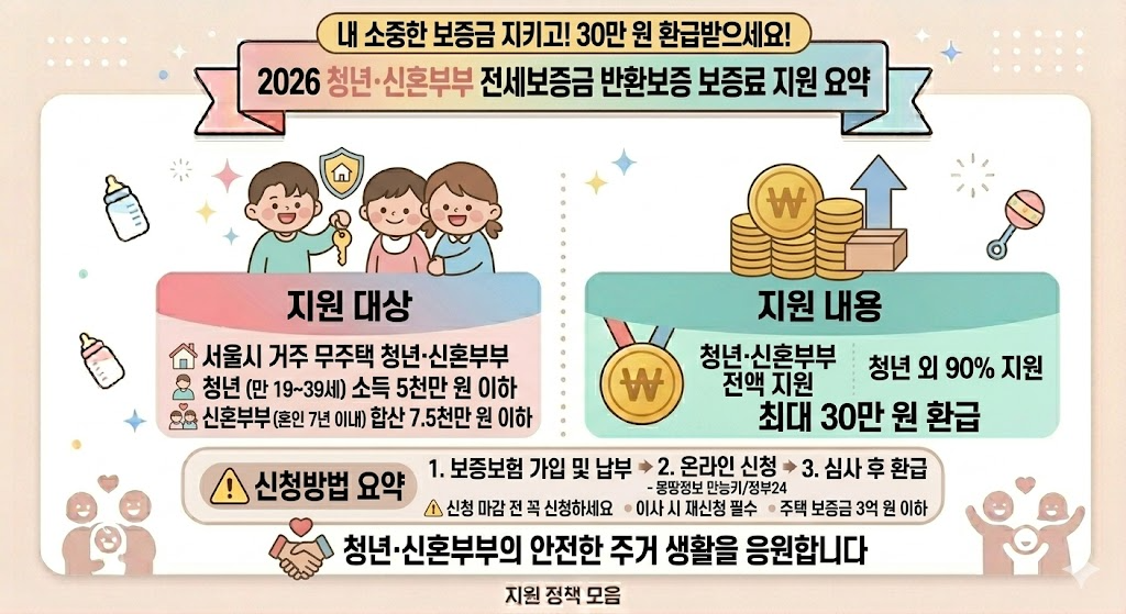 보험료가 아까워서 망설이셨다면 주목해 주세요! 서울시가 청년과 신혼부부를 위해 이미 납부한 보증료를 최대 30만 원까지 현금으로 돌려드립니다. 2026년 기준, 신청 방법과 조건을 상세히 알려드릴게요.